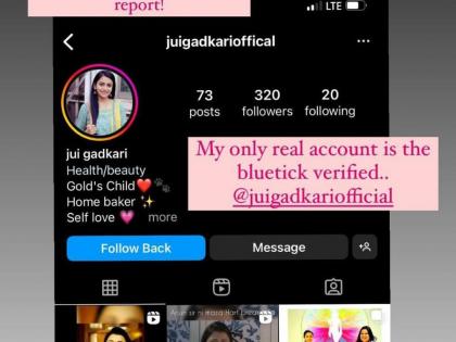 जुईनं याबाबत स्क्रीनशॉट शेअर करत चाहत्यांना आकाऊंट रिपोर्ट करण्याची विनंती केली. स्टोरीमध्ये तिनं लिहलं, 'एखाद्या सेलिब्रिटीचं फॅनपेज बनवणं वाईट नाही. परंतु, बनावट पेज बनवून माझ्या नावाने खोटं चॅटिंग करून फसवणूक करणं हे खूपच चुकीचं आहे. कृपया या अकाऊंटवर कोणालाही उत्तर देऊ नका…प्लीज रिपोर्ट या अकाऊंटला रिपोर्ट करा.माझं खरं अकाऊंट ब्लू टिक व्हेरिफाईड आहे आणि माझं युजरनेम @ juigadkariofficial असं आहे'.