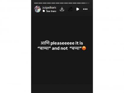 गणरायाच्या आगमनासाठी घरोघरी सर्व सदस्य आणि जागोजागी असलेले गणपती मंडळ सज्ज आहेत. अनेकदा रस्त्यावर गणेशोत्सवाचे काही बॅनरही लागल्याचं आपण पाहतो. सोशल मीडिठयावरही बरेच चण सणाच्या निमित्ताने व्यक्त होतात. तेव्हा कुठेतरी कधीतरी तुम्हीही 'बाप्पा' नाही तर 'बप्पा' असं लिहिलेलं वाचलं असेलच. अशा लोकांवर जुई भडकली आहे. तिने इन्स्टाग्राम स्टोरीवर लिहिले, आणि pleaseeee it is "बाप्पा" and not "बप्पा". यासोबत तिने रागीट इमोजीही शेअर केला आहे.