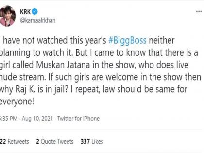 ‘मी यंदाचं बिग बॉस पाहिलेलं नाही, ना पाहण्याचा प्लान आहे. पण हो, या शोमध्ये मुस्कान म्हणजे मूस जट्टाना नावाची एक मुलगी आहे, असं मला कळलं. जी यूड लाइव्ह स्ट्रीमिंग करते. शोमध्ये तिच्यासारख्या मुलींचं स्वागत होत असेल त्तर मग राज कुंद्रा तुरुंगात का आहे? मी पुन्हा सांगतो कायदा हा सर्वांसाठी समान असायला हवा,’ असं केआरकेनं त्याच्या ट्वीटमध्ये म्हटलं आहे.