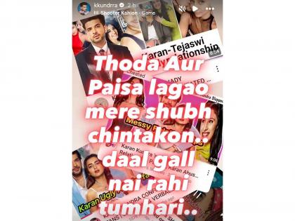 करण कुंद्राने इन्स्टाग्राम स्टोरीवर त्याच्यासंबंधी सर्व बातम्यांचे स्क्रीनशॉट टाकले आहेत. यामधअये तेजस्वी आणि त्याच्या ब्रेकअपच्या चर्चा, तेजस्वीसाठीच अनुषाला सोडल्याची बातमी आहे. या सगळ्या फोटोंवर कॅप्शन देत करणने लिहिले, "माझ्या हितचिंतकांनो, थोडा आणखी पैसा लावा...तुम्ही इथे काहीही साध्य करु शकणार नाही." तसंच त्याने ट्विटरवरही ट्रोलर्सला उत्तर देत लिहिले. त्याच्या विरोधात चालणाऱ्या सर्व स्टोरीज पेड असल्याचं त्याचं म्हणणं आहे. हे मिडिया पेजेस नाही तर युट्यूब चॅनल्स आहेत जे खोट्या बातम्या पसरवत आहेत. तो लिहितो, "या लोकांसाठी एक गो फंड मी सुरु करण्याचा माझा विचार करतोय. बिचारे कमी बजेट वाल्या पेजेसलाच पैसे देत आहेत..दु:खद."
