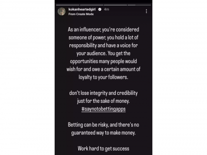 अंकिताने इन्स्टाग्रामवर स्टोरी शेअर केली आहे. तिनं लिहलं, "एक इन्फ्लुएन्सर म्हणून तुम्ही कोणाची तरी ताकद आहात. तुमच्यावर एक जबाबदारी आहे. तुम्हाला लोकांसाठी आवाज उठवता येतो. तुम्हाला अशा संधी मिळतात, ज्या मिळवण्यासाठी अनेक जण धडपडत असतात. म्हणून तुम्ही तुमच्या फॉलोवर्सशी प्रामाणिक असणं आवश्यक आहे. त्यामुळे फक्त पैशासाठी प्रामाणिकपणा आणि विश्वासार्हता गमावू नका. #saynotobettingapps सट्टेबाजी धोकादायक असू शकते आणि पैसे कमविण्याचा हा कोणताही योग्य मार्ग नाही. यश मिळविण्यासाठी कठोर परिश्रम करा" असं तिनं म्हटलं आहे.