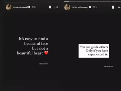 सोशल मीडियावर पोस्ट शेअर करत लता सबरवालने घटस्फोट घेत असल्याची माहिती चाहत्यांना दिली होती. त्यानंतर आता तिने पुन्हा क्रिप्टिक पोस्ट शेअर केली आहे. "सुंदर दिसणारी व्यक्ती शोधणं हे सोपं आहे पण, सुंदर हृदयाची माणसं शोधणं नाही", असं तिने एका पोस्टमध्ये म्हटलं आहे. तर दुसऱ्या पोस्टमध्ये ती म्हणते, "तुम्ही दुसऱ्यांना तेव्हाच सल्ला देऊ शकता जेव्हा तुम्ही स्वत: त्याचा अनुभव घेतलेला असेल". घटस्फोटानंतर लता सबरवालने केलेल्या या पोस्टची चांगलीच चर्चा रंगली आहे.
