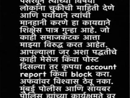 मीराने तिच्या इंस्टाग्राम हँडलवर ही स्टोरी शेअर केली होती, जी आता तिने डिलीट केली आहे. यात मीराने लिहिले होते, सोशल मीडियावर एखाद्या विषयी घाणेरड्या अफवा पसरवून त्यांच्या विषयी लोकांना चुकीची माहिती देणे आणि पर्यायाने त्यांची मानहानी करणे हा कायद्याने शिक्षेस पात्र गुन्हा आहे. जो काही समाजकंटक आता माझ्या विरुद्ध करत आहेत. आपल्याला जर अशा पद्धतीचे काही मेसेज किंवा पोस्ट दिसल्या तर कृपया अकाऊंट रिपोर्ट किंवा ब्लॉक करा. अफवांवर विश्वास ठेवू नका. मुंबई पोलीस आणि सायबर पोलीस यांच्या कार्यक्षमतेवर माझा पूर्ण विश्वास आहे आणि लवकरच गुन्हेगार पकडले जातील'.