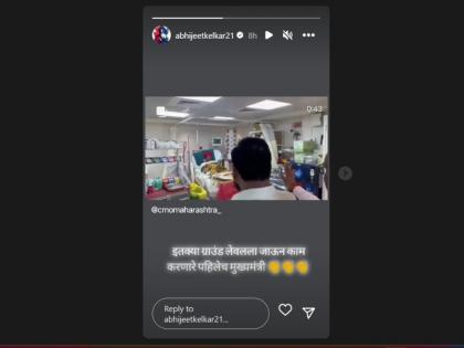 मुख्यमंत्री एकनाथ शिंदेंनी सोमवारी(२१ ऑगस्ट) परळ येथील केईम रुग्णालयात अचानक दाखल होत तेथील रुग्णांची भेट घेतली. यावेळी त्यांनी रुग्णालयातील कामकाजाचाही आढावा घेतला. केईम रुग्णालयातील एकनाथ शिंदेंचा हा व्हिडिओ मुख्यमंत्र्यांच्या सोशल मीडिया अकाऊंटवरुन शेअर करण्यात आला होता. अभिजीत केळकरने हा व्हिडिओ त्याच्या इन्स्टाग्राम स्टोरीमध्ये शेअर करत मुख्यमंत्र्यांचं कौतुक केलं आहे. “इतक्या ग्राऊंड लेव्हलला जाऊन काम करणारे पहिलेच मुख्यमंत्री”, असं त्याने इन्स्टा स्टोरीमध्ये म्हटलं आहे.