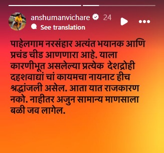 जम्मू काश्मीरमधील पहलगाम येथे घडलेल्या दुर्दैवी घटनेवर पोस्ट शेअर अंशुमन विचारेने आपलं मत मांडलं आहे. आपल्या अधिकृत इनस्टाग्राम स्टोरीवर शेअर केलेल्या पोस्टमध्ये अभिनेत्याने लिहिलंय की, "पहलगाम नरसंहार अत्यंत भयानक आणि प्रचंड चीड आणणारा आहे. याला कारणीभूत असलेल्या प्रत्येक देशद्रोही दहशतवाद्यांचा कायमचा नायनाट हीच श्रद्धांजली असेल. आता यात राजकारण नको. नाहीतर अजून सामान्य माणसाला बळी जावं लागेल." अशी सूचक पोस्ट त्याने लिहिली आहे.