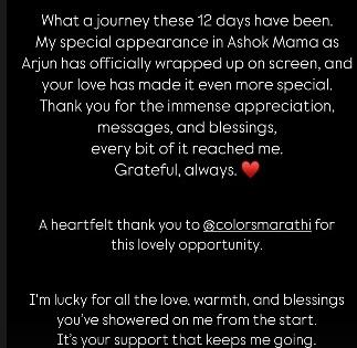 पुढे त्याने लिहिलंय, "सुरुवातीपासूनच तुम्ही माझ्यावर केलेल्या प्रेम आणि आशीर्वादामुळे मी स्वत:ला भाग्यवान समजतो. तुमचा पाठिंबा कायम मला पुढे जाण्यासाठी प्रेरणा देतो. तुमच्या आशीर्वादाने मी लवकरच एक नवीन कथा आणि एका नवीन भूमिकेतून पुन्हा एकदा तुमच्या भेटीला येईन." अशी भावुक पोस्ट लिहून अभिनेत्याने त्याच्या भावना व्यक्त केल्या आहेत.