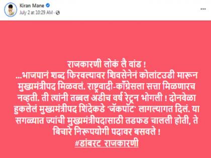 तीन दिवसांआधी किरण माने यांनी अशीच एक राजकीय पोस्ट शेअर केली होती. ‘भाजपानं शब्द फिरवल्यावर शिवसेनेनं कोलांटउडी मारून मुख्यमंत्रीपद मिळवलं. राष्ट्रवादी-काँग्रेसला सत्ता मिळणारच नव्हती. ती त्यांनी तब्बल अडीच वर्ष रेटून भोगली. दोनवेळा हुकलेलं मुख्यमंत्रीपद शिंदेकडे ‘जॅकपॉट’ लागल्यागत दिलं. या सगळ्यात ज्यांची मुख्यमंत्रीपदासाठी तडफड चालली होती, ते बिचारे निरूपयोगी पदावर बसवले, डांबरट राजकारणी,’असं त्यांनी आपल्या पोस्टमध्ये लिहिलं होतं. त्यांनी ती पोस्टही तुफान व्हायरल झाली होती.