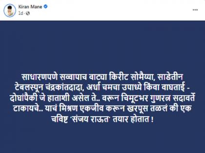 ‘साधारणपणे सव्वापाच वाट्या किरीट सोमैय्या, साडेतीन टेबलस्पून चंद्रकांतदादा, अर्धा चमचा उपाध्ये किंवा वाघताई - दोघांपैकी जे हाताशी असेल ते... वरून चिमूटभर गुणरत्न सदावर्ते टाकायचे.. याचं मिश्रण एकजीव करून खरपूस तळलं की एक चविष्ट ‘संजय राऊत’ तयार होतात !’, अशी पोस्ट किरण माने यांनी केली आहे.