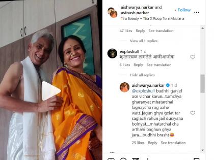 अशी कमेंट पाहून ऐश्वर्या नारकर या शांत बसल्या नाहीत. त्यांनी त्या कमेंटवर सडेतोड उत्तर देत लिहिले, 'बुद्धी गंजेल असे विचार करुन..तुमच्या घराण्यात म्हातारचळ लागण्याचा रोग आहे वाटतं...जगून घ्या गेलात तर सगळंच राहून जाईल दुसऱ्यांना बोलण्यात...म्हातारचळचा अर्थही बघून घ्या जरा..बुद्धी भ्रष्ट'