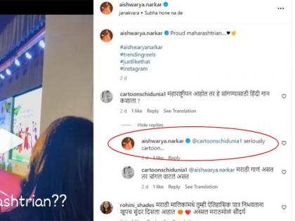'महाराष्ट्रीयन आहोत तर हे सांगायला हिंदी गाणं कशाला?' असा प्रश्न एका युजरने विचारला. त्यावर, 'खरंच कार्टून आहेस तू', असं प्रत्युत्तर ऐश्वर्या नारकर यांनी दिलं. कार्टून की दुनिया या अकाऊंटवरुन ही कमेंट करण्यात आली होती. दरम्यान, अलिकडेच ऐश्वर्या यांनी इन्स्टाग्रामवर आस्क मी एनिथिंग हे सेशन घेतलं होतं. या सेशनमध्ये चाहत्यांनी त्यांना प्रोफेशनल लाइफसोबत पर्सनल आयुष्याविषयी देखील प्रश्न विचारले होते.
