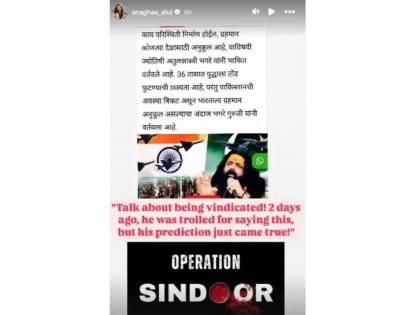 अनघाने इन्स्टाग्राम स्टोरीवर सांगितलं की, "दोन दिवसांपूर्वीच बाबांनी यावर भाकीत केलं होतं. परंतु त्यांना ट्रोल करण्यात आलं. पण त्यांनी केलेलं भाकीत खरं ठरलं" अशाप्रकारे अनघाने बाबांना समर्थन देऊन सर्व ट्रोलर्सची तोंडं बंद केली. अनघाने या पोस्टसोबत 'ऑपरेशन सिंदूर'चा फोटोही शेअर केला. अनघाच्या वर्कफ्रंटबद्दल सांगायचं तर ती सध्या प्रशांत दामलेंसोबत 'शिकायला गेलो एक' नाटकात अभिनय करत आहे.