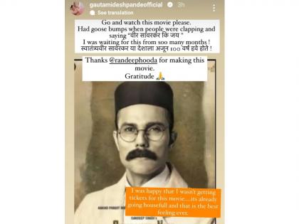 बहुचर्चित आणि बहुप्रतीक्षित 'स्वातंत्र्यवीर सावरकर' हा सिनेमा नुकताच प्रदर्शित झाला आहे. रणदीप हुड्डा मुख्य भूमिकेत असलेल्या या सिनेमातून वीर सावरकरांचा जीवनपट मोठ्या पडद्यावर मांडण्यात आला आहे. या सिनेमाला प्रेक्षकांकडून उत्तम प्रतिसाद मिळत आहे. 'स्वातंत्र्यवीर सावरकर' सिनेमातील रणदीप हुड्डाच्या अभिनयाचं सर्वत्र कौतुक होत आहे. अनेक सेलिब्रिटींनीही या सिनेमाबाबत पोस्ट शेअर केली आहे. नुकतंच प्रसिद्ध मराठी अभिनेत्री गौतमी देशपांडेनेही 'स्वातंत्र्यवीर सावरकर' सिनेमासाठी पोस्ट लिहिली आहे.