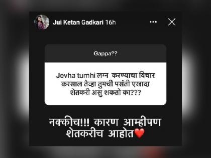 'नक्कीच! कारण, आम्ही पण शेतकरीच आहोत', असं म्हणत जुईने लग्नाचा विचार केल्यानंतर एका शेतकरी मुलासोबत लग्न करु शकते असं सांगितलं. तिच्या या उत्तराने तिने चाहत्यांची मन जिंकली आहेत.