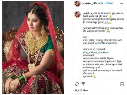 सोशल मीडियावर सक्रीय असलेल्या प्राजक्ताने इन्स्टाग्रामवर सगळ्यांना अक्षय्य तृतीयेच्या आणि ईदच्या शुभेच्छा देत १ मे रोजी राज ठाकरेंनी दिलेल्या भाषणावर प्रतिक्रिया दिली आहे. मात्र, ही पोस्ट तिने काही काळातच एडिट केली. इतकंच नाही तर, या पोस्टमधील राज ठाकरे यांच्या भाषणावरील तिची प्रतिक्रिया तिने डिलीट केली असून या पोस्टमध्ये आता केवळ अक्षय तृतीयेच्या शुभेच्छा वर ईदच्या शुभेच्छाच दिसून येत आहेत.