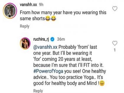 'कदाचित गेल्या वर्षभरापासून मी ही पँट परिधान करतेय आणि आणखी पुढची २० वर्षे मी ती सहज घालू शकते. कारण मला २० वर्षांनंतरही मला ती फिट येईन, याची मला खात्री आहे. ही सर्व पॉवर योगाची कमाल आहे. एक सल्ला तुम्हालाही देते, तुम्हीही योगा करा, हे निरोगी शरीर आणि निरोगी मनासाठी उत्तम आहे,' असं रुचिराने या ट्रोलरला सुनावलं.
