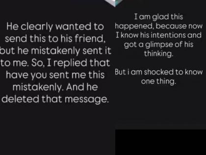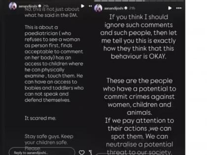 खरं तर त्या चाहत्याला हा मेसेज त्याच्या मित्राला पाठवायचा होता. पण, त्याने चुकून हा मेसेज आनंदीलाच पाठवला. त्यानंतर आनंदीने त्याला "तू चुकून मला मेसेज पाठवालास", असं म्हटल्यानंतर त्याने हा मेसेज डिलीट केल. पुढच्या स्टोरीमध्ये आनंदी म्हणते, "बरं झालं हे घडलं. कारण यामुळे मला ती व्यक्ती माझ्याबद्दल काय विचार करते आणि त्याचं उद्दीष्ट काय आहे हे कळलं. पण मला धक्का बसला आहे. हे फक्त त्याने मला काय मेसेज केला याबद्दल नाहीये. कारण ती व्यक्ती एक बालरोगतज्ञ आहे. (जो एका स्त्रीला व्यक्ती म्हणून पाहत नाही तर तिच्या शरीरावर कमेंटही करतो). त्याला मुलांना स्पर्श करण्याचा. शारीरिकरित्या तपासण्याचा अधिकार आहे. जे स्वत:चा बचाव करू शकत नाहीत किंवा बोलू शकत नाहीत. यामुळे मी घाबरले आहे".