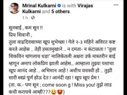 मृणाल कुलकर्णी यांनी सोशल मीडियावर शिवानीचा फोटो शेअर करत लिहिले, ''सूनबाई, कम सून !! प्रिय शिवानी, तुला वाढदिवसाच्या खूप शुभेच्छा ! गेले २-३ महिने अविरत कष्ट करते आहेस .. तेही हसतमुखाने… न दमता-न कंटाळता ! “तुला शिकविन चांगलाच धडा” मालिकेतली अक्षरा उर्फ मास्तरीन बाई म्हणून अमाप लोकप्रिय झाली आहेस. आम्हाला तुझ्या यशाचा खूप आनंद आहे. अभिमान आहे ! अशीच यशस्वी हो.. तुझी सारी स्वप्नं पूर्ण होऊ देत ! आनंदी रहा ! खूप खूप प्रेम ! (ता. क.- पण सून, come soon g ! Miss you! तुझे लाड कधी करायचे आम्ही?)