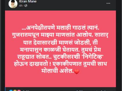“अनपेक्षितपणे मलाही गाठलं त्यानं. गुजरातमधून माझ्या माणसांत आलोय. सातार्यात देवासारखी माणसं जोडली, ती मनापासून काळजी घेतायत. तुमचं प्रेम राहूद्यात सोबत.. चुटकीसरशी ‘निगेटिव्ह’ होऊन दाखवतो ! एकाकीपणात तुमची साथ मोलाची असेल” अशी फेसबुक पोस्ट त्यांनी शेअर केली आहे. त्यांच्या या पोस्टवर चाहते त्यांना काळजी घेण्यास सागंत असल्याचे पाहायला मिळत आहेत.