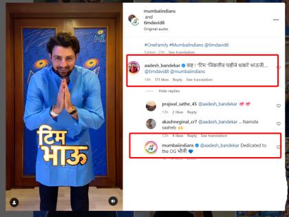 टिम डेव्हिडचा हा व्हिडिओ सोशल मीडियावर व्हायरल झाला आहे. मुंबई इंडियन्सच्या फॅन्सने या व्हिडिओवर कमेंट केल्या आहेत. तर महाराष्ट्राच्या लाडक्या आदेश भाऊजींनाही या व्हिडिओवर कमेंट करण्याचा मोह आवरता आलेला नाही. या व्हिडिओवर आदेश बांदेकरांनी "वाह! 'टिम' जिंकलीच पाहिजे धाकटे भाऊजी..." अशी मजेशीर कमेंट केली आहे. या कमेंटवर मुंबई इंडियन्सच्या टीमकडून रिप्लाय देण्यात आला आहे.