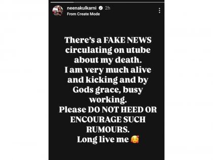 सोशल मीडियावर कधी काय पसरेल सांगता येत नाही. अनेकदा जिवंत माणसांनाही थेट मृत घोषित केलं जातं. ते व्हायरलही होतं. खात्री न करता अशा बातम्या दिल्या जातात. याचा त्या व्यक्तीवर आणि तिच्या कुटुंबावर काय परिणाम होतो याचा कोणी विचार करत नाही. दरम्यान नीना कुळकर्णी यांच्याही निधनाची बातमी एका युट्यूब चॅनलवर आली. यावर रिअॅक्ट करत नीना कुळकर्णींनी लिहिले, "युट्यूबवर माझ्या निधनाची फेक बातमी पसरत आहे. मी जिवंत आहे आणि स्वस्थ आहे. देवाच्या कृपेने कामात व्यस्त आहे. कृपया अशा अफवांकडे दुर्लक्ष करा आणि प्रोत्साहन देऊन नका. मला दीर्घायुष्य मिळो."