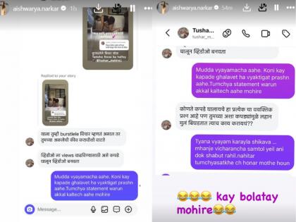 ऐश्वर्या नारकर यांनी त्यांच्या इन्स्टाग्रामवर योगचा एक व्हिडीओ शेअर केला. या व्हिडीओवर नेटकऱ्याने कमेंट केली, ''निदान कॅमेरासमोर तरी फूल कपडे घालून योगा करत जा मॅडम'', नेटकऱ्याची ही कमेंट ऐश्वर्या यांनी शेअर केली. त्यांनी त्याला उत्तर दिलं की, ''बुरसटलेले विचार सोडा, तुमचा फोकस का हलतोय?''. यावर त्या नेटकऱ्याने ऐश्वर्या यांना पर्सनल मेसेज करुन सांगितलं की, ''याला तुम्ही बुरसटलेले विचार म्हणत असाल तर तुमच्या अकलेची कीव करावीशी वाटते, व्हिडीओला views वाढवण्यासाठी असे कपडे घालून व्हिडीओ बनवता?''