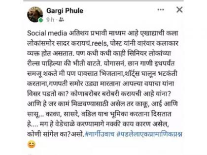 गार्गी लिहिते,'सोशल मीडिया अतिशय प्रभावी माध्यम आहे. एखाद्याची कला लोकांसमोर सादर करायचं. रील्स, पोस्ट यांनी वारंवार कलाकार व्यक्त होत असतात. पण कधी कधी सिनियर लोकांच्या रील्स पाहिल्या की भीती वाटते. योगासनं, छान गाणी इथपर्यंत समजू शकते मी पण पावसात भिजताना, शॉर्ट्स घालून भटकंती करताना, गणपतीसमोर उड्या मारताना आपल्या वयाचा यांना विसर पडतो का? कोणाबरोबर बरोबरी करायची आहे यांना? आणि हे जर कामं मिळवण्यासाठी असेल तर काकू, आई आणि सासू...काका, सासरे, वडील याच भूमिका करताना दिसतात हे..मग हे वेडेचाळे करण्यामागे नक्की काय कारण असेल, कोणी सांगेल का? असो. #गार्गीउवाच #पडलेलाएकप्रामाणिकप्रश्न'