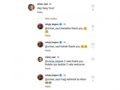 अभिनेत्री ऋतुजा बागवेने नुकतेच एक फोटोशूट केले. लाल रंगाच्या स्वीव्हलेस आणि ओपन थाय गाऊमध्ये ती कमालीची सुंदर दिसत होती. तसंच गळ्यात एक नाजुक नेकलेसही घातला होता. तिच्या या फोटोवर ओंकार राऊतने 'हे सेक्सी यू' अशी कमेंट केली. तर यावर ऋतुजाने 'हाहा थँक यू' अशी कमेंट केली. ऋतुजाची ही कमेंट चुकून दोन वेळी पोस्ट झाली. तर यावर ओंकारने तिची चेष्टा केली. तो म्हणाला, 'दोन वेळा थँक यू बोललीस त्याबदद्ल दोन वेळा वेलकम'. त्याच्या या कमेंटवर ऋतुजा म्हणाली, 'मग नेटवर्कलाही म्हण'.