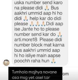 आरती मोरेने आपल्या इन्स्टाग्राम अकाउंटवर पोस्ट शेअर करत विचित्र अनुभव शेअर केला आहे. सोशल मीडियावर एका अज्ञात व्यक्तीकडून आपल्याला मेसेज विचित्र आल्याचा तिने सांगितलं आहे. शिवाय चाहत्यांना सावध राहण्याचं तिने आवाहन सुद्धा केलं आहे. त्या अज्ञात व्यक्तीने थेट अभिनेत्रीला इन्स्टाग्रामवर मेसेज करत म्हटलंय, "दीदी मला तुम्ही एक मदत करु शकता का तुम्ही ऐश्वर्या चौधरीला ओळखता का जर तुम्ही तिला ओळखत असाल तर कृपया दीदी मला तिचा नंबर पाठवाल का तुम्हीच माझी शेवटची आशा आहात. दीदी जर तुम्ही तिला ओळखत असाल तर नंबर सेंड करा. कृपया दीदी माझा नंबर ब्लॉक करु नका. तुम्हीच माझी शेवटची आशा आहात त्यामुळे याबद्दल मी तुम्हाला विचारतो आहे." असा मेसेज अभिनेत्रीला त्या अज्ञात व्यक्तीने केला आहे.