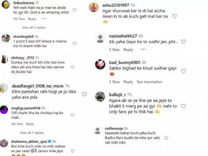 "ही तीच आहे ना जी मरुन पुन्हा जिवंत झाली होती?", "एका वेळेनंतर फक्त देवाच्या दारातच शांती मिळते", "इथे आली आहेस तर सुधर आता", "चांगलं जीवन जगण्याची सुरुवात केली आहेस तर आता काहीही चुकीचं करू नकोस", "सगळ्यांना बिघडवून आता स्वत: सुधारत आहे", अशा अनेक कमेंट्स चाहत्यांनी केल्या आहेत.