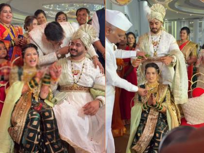 प्राजक्ता गायकवाडने लग्नात हिरव्या रंगाची नऊवारी नेसली होती. त्यावर भरजरी सोन्याचे दागिने, नथ, मुंडावळ्या अशा नव्या नवरीचा सुंदर लूक आहे. तर शंभुराने गुलाबी रंगाची शेरवानी परिधान केली आहे. तसंच डोक्यावर फेटा बांधला आहे. त्यांच्या लग्नाचा अगदी राजेशाही थाट दिसत आहे. पुण्यात त्यांचा हा विवाहसोहळा पार पडला. नवऱ्याचा कानपिळीचा व्हिडीओ ही समोर आला आहे. तसंच प्राजक्ताला मंगळसूत्र घालतानाचाही व्हिडीओ व्हायरल होत आहे.