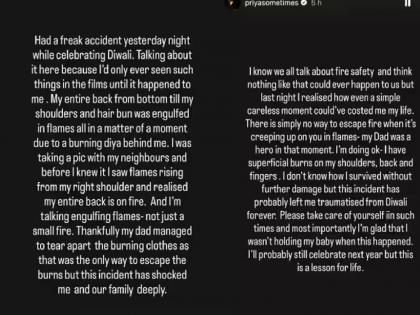 प्रिया मलिक कुटुंब आणि शेजाऱ्यांसोबत दिवाळी साजरी करत होती. याचवेळी तिने घातलेले कपडे मागे असलेल्या जळत्या पणतीच्या संपर्कात आले आणि आग भडकली. इन्स्टाग्रामवर तिने ही भयावह घटना सांगितली आहे. ती लिहिते, "मी माझ्या शेजाऱ्यांसोबत फोटो काढत होते. काही कळायच्या आत मला माझ्या उजव्या खांद्याजवळ आगीचा भडकला दिसला. नंतर मला कळलं की माझी पूर्ण पाठ जळत आहे आणि मी अक्षरश: आगीच्या ज्वाळांच्या संपर्कात होते. ही काही छोटी मोठी आग नव्हती. नशीब माझे वडिलांनी आग लागलेला कपड्यांचा भाग लगेच फाडला. कारण त्यातून वाचण्याचा हा एकच मार्ग होता. मात्र या घटनेमुळे मला आणि माझ्या कुटुंबाला मोठा धक्का बसला."