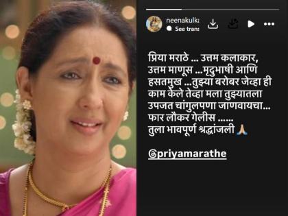 ज्येष्ठ अभिनेत्री नीना कुलकर्णी लिहितात, 'प्रिया मराठे...उत्तम कलाकार, उत्तम माणूस, मृदुभाषी आणि हसतमुख..तुझ्याबरोबर जेव्हाही काम केले तेव्हा मला तुझ्यातला उपजत चांगुलपणा जाणवायचा...फार लवकर गेलीस, तुला भावपूर्ण श्रद्धांजली'