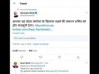 पंतप्रधान नरेंद्र मोदी यांनी 5 एप्रिलला रात्री 9 वाजता 9 मिनिट दिवे, मेणबत्ती, टॉर्च पेटवा असे आवाहन केले होते. या आवाहनाला प्रतिसाद देत अरूण गोविल यांनी एक व्हिडीओ शेअर केला होता. हाच व्हिडीओ गोविल यांच्या फेक ट्विटर अकाऊंटवर अपलोड केला गेला होता आणि यात पीएम मोदींना टॅग केले गेले होते.