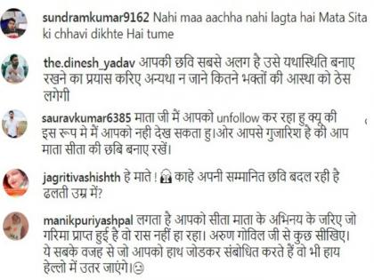 ‘हे माते! काहे अपनी सम्मानित छवि बदल रही है ढलती उम्र में,’ असं एका युजरने तिच्या व्हिडीओवर लिहिलं. कदाचित तुला सीता मातेच्या भूमिकेनं मिळालेला मानसन्मान पुरेसा नाही. अरूण गोविल यांच्याकडून काही शिक़, असं एका युजरने कमेंट करत लिहिलं. माताजी, तुला अनफॉलो करतोय. कारण मी तुम्हाला अशा अवतारात बघू शकत नाहीये, असं लिहित एका युजरने आपला संताप व्यक्त केला.
