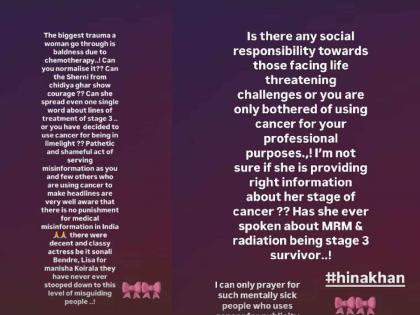 रोजलीनने आणखी एक स्टोरी शेअर करत लिहिले, "जे जीवघेण्या आजाराचा सामना करत आहेत त्यांच्याप्रती तुमची थोडीही सामाजिक जबाबदारी नाही का? की तुम्ही फक्त तुमच्या प्रोफेशनल हेतूसाठी कॅन्सरचा उपयोग करत आहात. ती तिच्या कॅन्सर स्टेजबद्दल किती खरी माहिती देत आहे मला शंकाच वाटत आहे. मी कॅन्सरची स्टेज ३ सर्वायवर आहे म्हणून विचारते की हिना कधी तिच्या MRM आणि रेडिएशनबद्दल बोलली का? पब्लिसिटी स्टंटसाठी कॅन्सरचा उपयोग करणाऱ्या अशा घाणेरड्या विचारांच्या लोकांसाठी मी प्रार्थना करते. चला कॅन्सर झालाच आहे तर बातमीच बनवू."