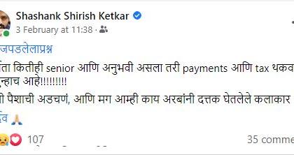निर्माता कितीही सिनीअर आणि अनुभवी असला तरी मानधन आणि कर थकवणं हा गुन्हाच आहे!!!!!!!!! त्यांची पैशाची अडचणं, आणि मग आम्ही काय अरबांनी दत्तक घेतलेले कलाकार ? असे सांगत त्याने आपला संताप सोशल मीडियावर व्यक्त केला आहे.