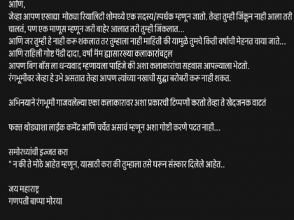पुढे तो म्हणाला, "जर तुम्ही हे नाही करू शकलात तर तुम्हाला नाही माहिती की यामुळे तुमचे किती वर्षांची मेहनत वाया जाते. आणि राहिली गोष्ट पॅडी दादा, वर्षा मॅम ह्यासारख्या कलाकारांबद्दल आपण बिग बॉसला धन्यवाद म्हणायला पाहिजे की अशा कलाकारांचा सहवास आपल्याला भेटतो. रंगभूमीवर जेव्हा हे उभे असतात, तेव्हा आपण त्यांच्या नखाची सुद्धा बरोबरी करू नाही शकत. अभिनयाने रंगभूमी गाजवलेल्या एका कलाकारावर अशा प्रकारची टिप्पणी करतो. तेव्हा ते खेदजनक वाटतं. फक्त थोड्याशा लाईक कमेंट आणि चर्चेत असावं म्हणून अशा गोष्टी करणे पटत नाही. समोरच्यांची इज्जत करा "न की ते मोठे आहेत म्हणून, यासाठी करा की तुम्हाला तसे घरून संस्कार दिलेले आहेत. जय महाराष्ट्र गणपती बाप्पा मोरया".