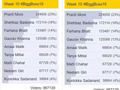 'बिग बॉस १९' चा सध्या १० वा आठवडा सुरू आहे. या आठवड्यात अशनूर कौर, अभिषेक बजाज आणि मृदुल तिवारी यांना सोडून सर्व सदस्य नॉमिनेटेड होते. चाहते आपल्या आवडत्या स्पर्धकांना वाचवण्यासाठी सतत मतदान करत आहेत. 'बिग बॉस वोट इन' नुसार, सध्याच्या (सकाळी १० वाजून २७ मिनिटांपर्यंत) वोटिंग ट्रेंडवर नजर टाकल्यास, प्रणित मोरेला सर्वाधिक मते मिळाली होती. बॉटम टू मध्ये आता नीलम आणि कुनिका यांची नावे आहेत.