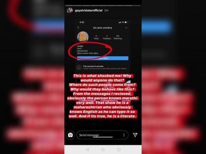 गायत्री हिने त्या व्यक्तीचे प्रोफाईलदेखील इंस्टा स्टोरीवर शेअर केले आहे. गायत्रीला अशाप्रकारे अश्लील मॅसेज येण्याची ही पहिली वेळ नाही. यापूर्वी देखील तिला अशा मॅसेजचा सामना करावा लागला होता.