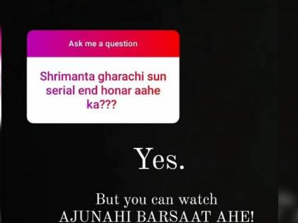 ‘श्रीमंताघरची सून’ ही मालिका संपणार आहे का? असा प्रश्न एका चाहत्याने केला असता, होय पण तुम्ही ‘अजूनही बरसात आहे’ ही मालिका पाहू शकणार आहात, असे उत्तर रूपलने दिले.