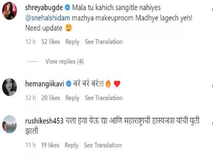 स्नेहलच्या या फोटोवर चाहतेच नाही तर कलाकारही संभ्रमात पडलेत. हे कधी झालं असा काहीसा प्रश्न सर्वांना पडला आहे. स्नेहलच्या पोस्टवर अभिनेत्री श्रेया बुगडेने कमेंट केली आहे. ती म्हणते, 'मला तू काहीच सांगितलं नाहीएस. माझ्या मेकअप रुममध्ये लगेच ये. अपडेट हवं आहे. तर हेमांगी कवीने 'बरं बरं बरं!' असं कॅप्शन लिहिलं आहे. याशिवाय एका चाहत्याने 'चला हवा येऊ द्या आणि महाराष्ट्राची हास्यजत्रा यांची युती झाली' असं भन्नाट कॅप्शन लिहिलं आहे.