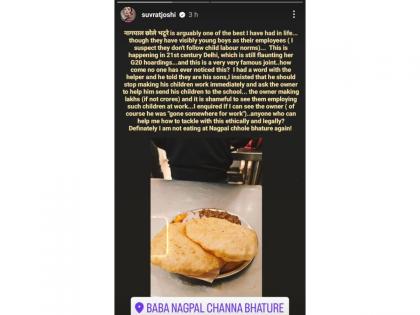 सुव्रतने त्याच्या इन्स्टाग्राम अकाऊंटवरुन एक स्टोरी शेअर केली आहे. या स्टोरीमध्ये त्याने दिल्लीत एक प्रसंग शेअर केला आहे. दिल्लीतील प्रसिद्ध अशा नागपाल छोले भटूरेबाबत सुव्रतने पोस्ट लिहिली आहे. या छोले भटुरेच्या हॉटेलमध्ये बालकामगार काम करत असल्याचं सुव्रतने म्हटलं आहे.