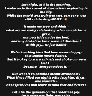 यापुढे करिश्माने म्हटलंय, "मोठा आवाज म्हणजे आनंद, धूर म्हणजेच उत्सव साजरे करणं, मुक्या प्राण्यांना घाबरवणं आणि स्वत:लासुद्धा धुराचा त्रास करून घेणं आपण आपल्या मुलांना हे शिकवतोय का? मुक्या प्राण्यांमध्ये भीती निर्माण करणं, प्रदुषण करणाऱ्या फटाक्यांपेक्षा आपण आपल्या जवळच्या व्यक्तींसोबत वेळ घालवणं, दिवे लावणं आणि सगळीकडे आनंद पसरवणं म्हणजे सण साजरा करणं ही जाणीव त्यांच्यात निर्माण केली पाहिजे. खरंतर, आपण अशी पिढी घडवूया ज्यांच्यासाठी सण म्हणजे आनंद आणि शांतता पसवरणं हे महत्वाचं असेल प्रदुषण करणं नाही. दरम्यान, ही पोस्ट थोडी उशिराच पोस्ट केली, पण काय करणार? हे फटाके थांबतच नाहीत.म्हणून पोस्ट शेअर करणं मला गरजेचं वाटलं."असं देखील अभिनेत्रीने याद्वारे स्पष्ट केलं आहे.