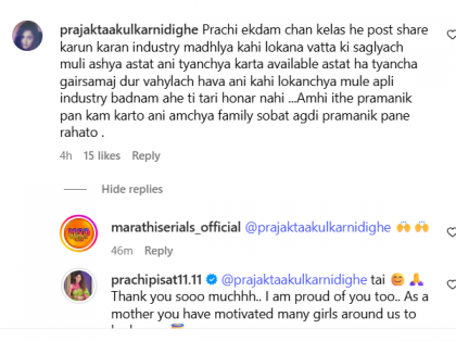प्राचीला सपोर्ट करताना ठरलं तर मग फेम अभिनेत्री प्राजक्ता दिघे कमेंट करत म्हणाल्या की, "प्राची खूप छान केलंस ही पोस्ट शेअर करुन. कारण इंडस्ट्रीतल्या काही लोकांना वाटतं की सगळ्याच मुली अशा असतात आणि त्यांच्यासाठी उपलब्ध असतात. हा त्यांचा गैरसमज दूर व्हायलाच हवा. आणि काही लोकांच्या मते आपली इंडस्ट्री बदनाम आहे ती तरी होणार नाही. आम्ही इथे प्रामाणिकपणे काम करुन आमच्या फॅमिलीसोबत प्रामाणिकपणे राहतो." प्राचीने या कमेंटखाली प्राजक्ता यांचे आभार मानत लिहिलं की, "ताई.. खूप खूप धन्यवाद.. मलाही तुमचा अभिमान आहे.. एक आई म्हणून तुम्ही कायमच आजूबाजूच्या अनेक मुलींना धाडसी होण्यास प्रेरित केले आहे."