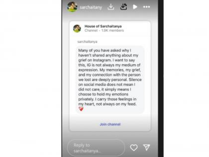 चैतन्यने एक पोस्ट शेअर केली आहे. या पोस्टमध्ये तो म्हणतो, "इन्स्टाग्रामवर मी दु:ख व्यक्त का केलं नाही याबाबत तुमच्यापैकी अनेकांनी मला विचारलं. मला हे स्पष्ट करावंसं वाटतं की इन्स्टाग्राम हे माझ्या भावना सांगण्याचं माध्यम नाही. ज्या व्यक्तीला आम्ही गमावलं त्यांच्यासोबतच्या आठवणी, दु:ख आणि त्यांच्यासोबत असलेलं कनेक्शन हे पर्सनल आहे. सोशल मीडियावर पोस्ट केली नाही याचा अर्थ मला फरक पडत नाही असा होत नाही. याचा अर्थ असा होतो की मी माझ्या भावना पर्सनल ठेवू इच्छितो. त्या भावना माझ्या सोशल मीडियावर दिसत नसल्या तरी हृदयात आहेत".
