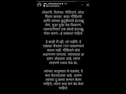 शिवानी सुर्वे हिने इंस्टाग्राम स्टोरीवर पोस्ट शेअर करत लिहिले की, लोकांनी, विशेषतः मीडियाने थोडा विचार करावा. सतत पीडितांचे आणि त्यांच्या कुटुंबीयांचे इंटरव्ह्यू घेणं, पुन्हा पुन्हा तेच विचारणं, एका मागोमाग एक सोलो इंटरव्ह्यू पोस्ट करणं हे थांबवलं पाहिजे. हे काही टीव्ही शो नाहीये. हे एखाद्या चॅनेलचं टीआरपी वाढवण्याचं साधन नाही. मीडियाने थोडं शहाणपण वापरावे. ज्यांच्यावर हा प्रसंग ओढवला आहे, त्यांना शांतपणे श्वास घेऊ द्या. त्यांच्या आयुष्यात जे घडलंय ते फार वेदनादायक आहे. आपण त्यांच्या दुःखाचा सन्मान केला पाहिजे, त्यांना त्रास देणं बंद केलं पाहिजे.