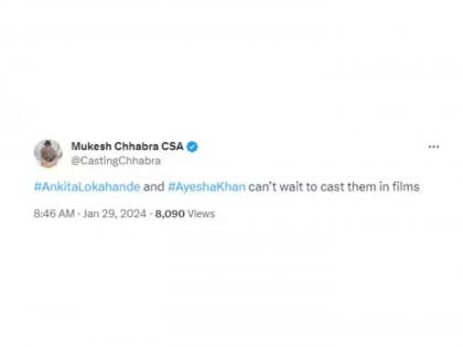 बॉलिवूडचे प्रसिद्ध कास्टिंग डायरेक्टर मुकेश छाबराने अंकिता लोखंडे आणि आयशा खान यांना घेऊन चित्रपट बनवण्याची घोषणा केल्याचे वृत्त आहे. खुद्द मुकेश छाबरा यांनी त्यांच्या एक्स अकाऊंटवर (ट्विटर) याबाबत एक पोस्ट शेअर केली आहे. त्याने आपल्या पोस्टमध्ये लिहिले की, 'चित्रपटात अंकिता लोखंडे आणि आयशा खानला कास्ट करण्यासाठी प्रतीक्षा करू शकत नाही'.