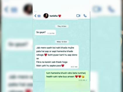 तुनिशाच्या चॅटचा हा स्क्रीनशॉट 6 ऑक्टोबरचा आहे. त्यादिवशी रात्री 11.30 वाजता तुनिशाने शीझान खानच्या आईला मेसेज केला आणि विचारलं - झोपलात का? पण शीझानच्या आईने तिच्या मेसेजला रिप्लाय दिला नाही. त्यानंतर 6 दिवसांनी 12 ऑक्टोबरला तुनिषाने पुन्हा शीझानच्या आईला मेसेज केला. तुनिशाने तिच्या मेसेजमध्ये लिहिले- "जेव्हा माझ्यासोबत कोणीही उभं नसतं, तेव्हा मला माहीत आहे की तुम्ही आणि आपी (फलक नाज) नेहमीच उभे राहाल."