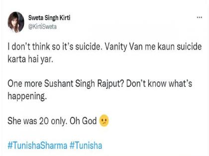 तुनिशा शर्माच्या आत्महत्येवर सुशांत सिंग राजपूतची बहीण श्वेता सिंग किर्तीने प्रतिक्रिया दिली आहे. आपल्या ट्विटमध्ये तिने तुनीशाच्या आत्महत्येवर प्रश्न उपस्थित केला आहे. श्वेता सिंहने तिच्या ट्विटमध्ये लिहिले- 'मला वाटत नाही की, ही आत्महत्या आहे. व्हॅनिटी व्हॅनमध्ये आत्महत्या कोण करते? अजून एक सुशांत सिंग राजपूत? काय होतंय कळत नाही. ती फक्त 20 वर्षांची होती.' असे ट्विट श्वेता सिंगने केले.