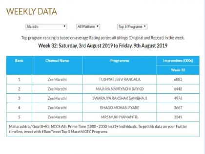 तर 'माझ्या नवऱ्याची बायको' मालिका यावेळी नंबर 2 वरच आहे. 'स्वराज्य रक्षक संभाजी' मालिका तिसऱ्या स्थानवर कायम आहे. तर नुकतीच सुरू झालेली 'भागो मोहन प्यारे' मालिकेनं या आठवड्यात चौथं स्थान पटकावलं आहे. 'मिसेस मुख्यमंत्री' मालिका पाचव्या स्थानावर आहे.